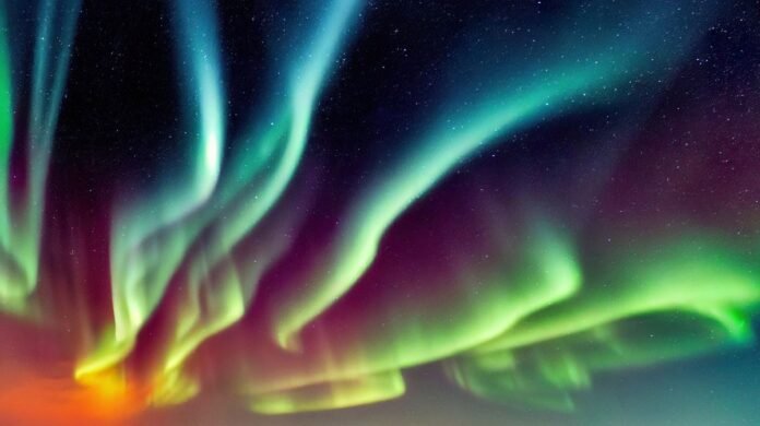 The Northern Lights, scientifically known as Aurora Borealis, manifest as colorful waves or curtains in the Earth’s atmosphere, predominantly in shades of green, pink, and red. These captivating hues result from charged particles from the Sun, or solar winds, colliding with gases in the upper atmosphere of our planet.