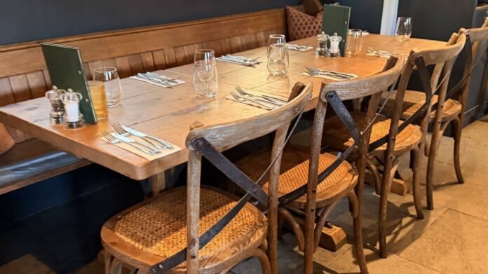 Presently, The Fox exudes an aura of long-standing comfort and familiarity. Upon entering, I immediately felt at ease in its homely yet stylish setting, characterized by flagstone flooring, dark blue and off-white walls, rustic wooden furnishings, and tasteful Christmas adornments. Seated at a cozy corner table, we savored Butty Bach ale and Jeremy Clarkson’s Hawkstone lager as we perused the menu. The wine selection, starting at an affordable price point, complemented the dining experience.