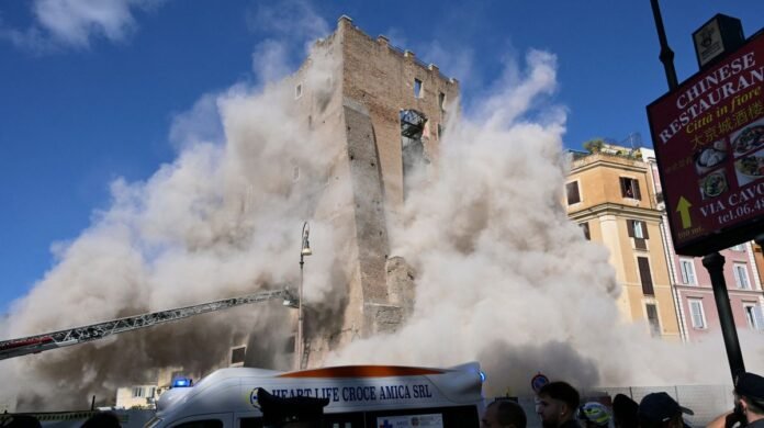 A worker was successfully rescued today in Rome after being trapped under debris from a medieval tower for several hours. The incident occurred during renovation work on the Torre dei Conti near the Colosseum when a section of the tower collapsed, leaving the worker stuck. Emergency responders carefully extracted him using a telescopic aerial ladder and a stretcher, transferring him to an ambulance. The worker’s condition was uncertain, but officials confirmed that he was conscious at the time of the rescue.